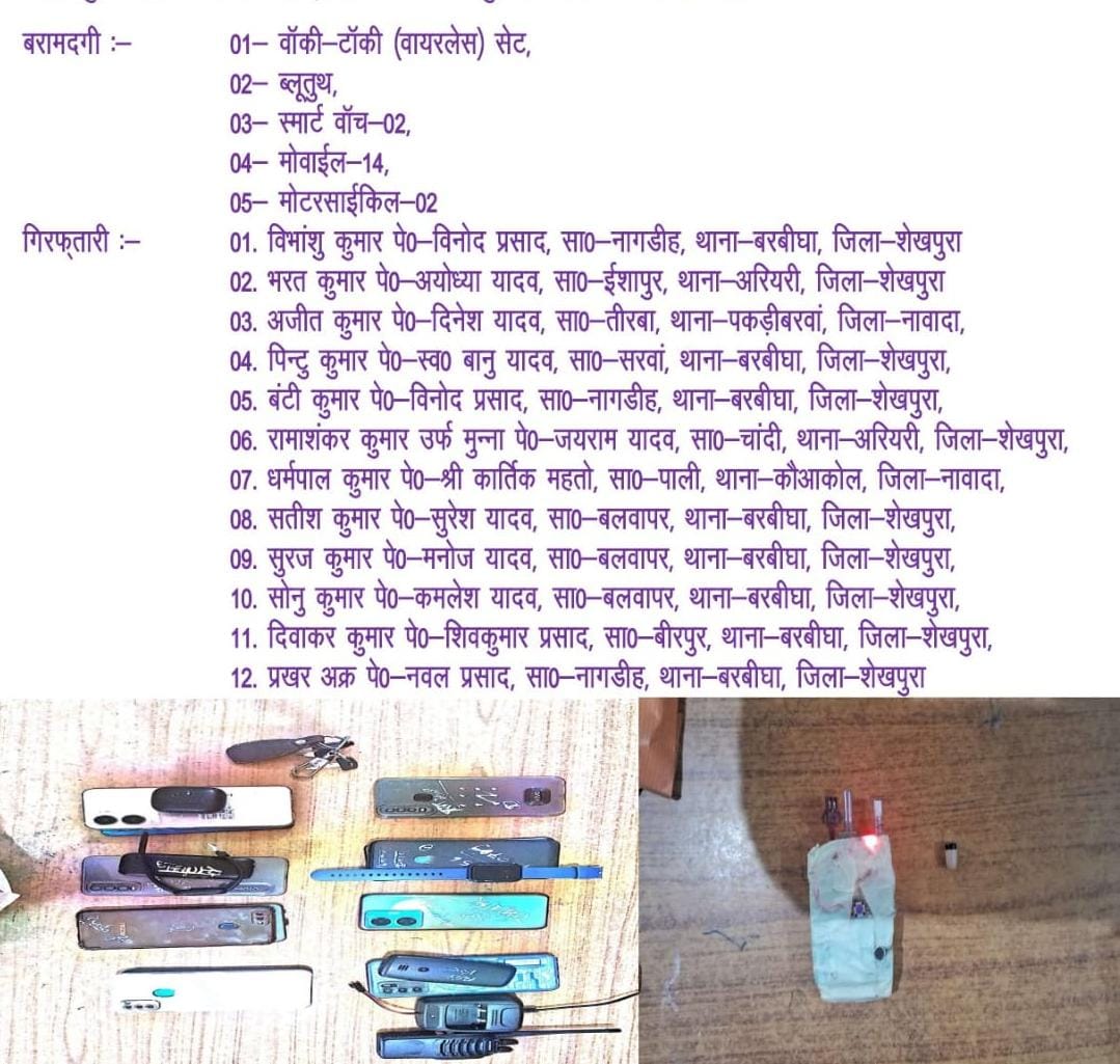रविवार को शेखपुरा के विभिन्न परीक्षा केंद्रों पर बिहार पुलिस सिपाही भर्ती परीक्षा का आयोजन हुआ। वहीं बिहार पुलिस सिपाही भर्ती परीक्षा के दौरान एक दर्जन वॉकी टॉकी एवं इलेक्ट्रॉनिक डिवाइस के माध्यम से नकल करने वाले गिरोह के सदस्यों को पकड़ा गया है। सभी लोग को पुलिस ने गिरफ्तार किया और प्राथमिक की दर्ज करते हुए जेल भेज दिया।