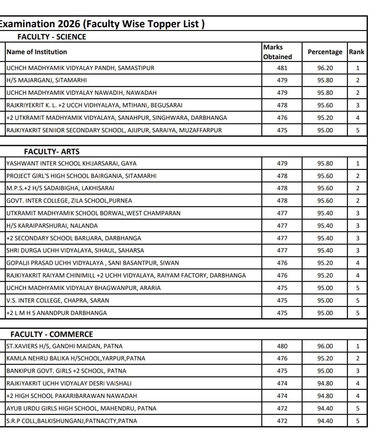 वहीं कला संकाय में गया जिले की निशु कुमारी 479 अंक (95.80 प्रतिशत) के साथ राज्य टॉपर बनीं।