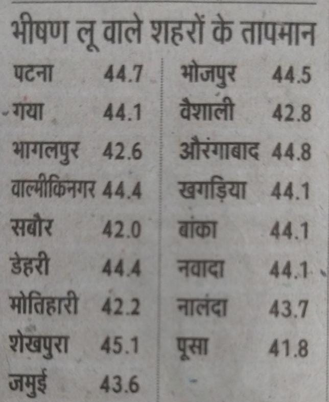 बिहार सरकार के मौसम विभाग के द्वारा शनिवार को ही चेतावनी जारी कर दी गई थी जिसमें बांका, जमुई, जहानाबाद, खगड़िया, लखीसराय, नालंदा, नवादा,पटना,समस्तीपुर,शेखपुरा में भीषण लू चलने की संभावना है। लोग विशेष रूप से 10 से 3 बजे के बीच धूप में निकलने से बचें ।