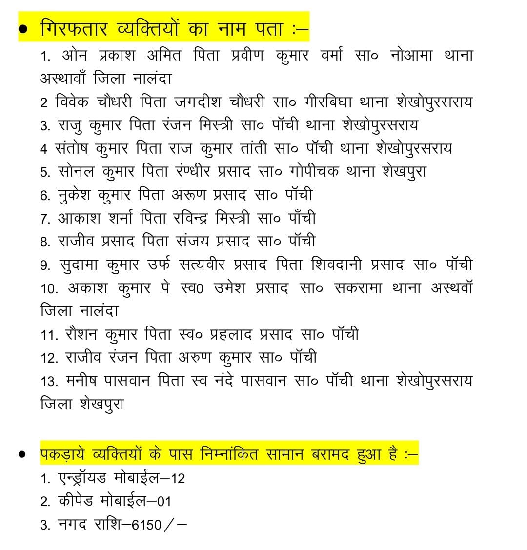शेखपुरा जिला के शेखोपुरसराय क्षेत्र में एक बार फिर से पुलिस को साइबर अपराधियों को पकड़ने में बड़ी कामयाबी मिली है। तेरह साइबर अपराधियों को पुलिस ने गिरफ्तार कर लिया । पकड़े गए साइबर अपराधियों से संदिग्ध लेनदेन, पुराने सिक्के के बदले अधिक राशि देने, रिलायंस फाइनेंस के नाम पर कर्ज देने के प्रमाण मिले हैं ।