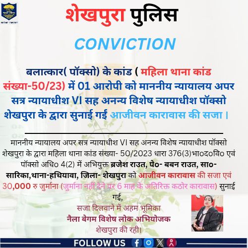 #SheikhpuraNews #PocsoCase #SheikhpuraCourt #LifeImprisonment #BiharCrimeNews #RapeCaseVerdict #MehusThana #BiharCourtNews #JusticeForMinor #BreakingNewsBihar #LegalNews #WomenSafety #POCSOAct #CrimeNewsBihar #CourtJudgment
