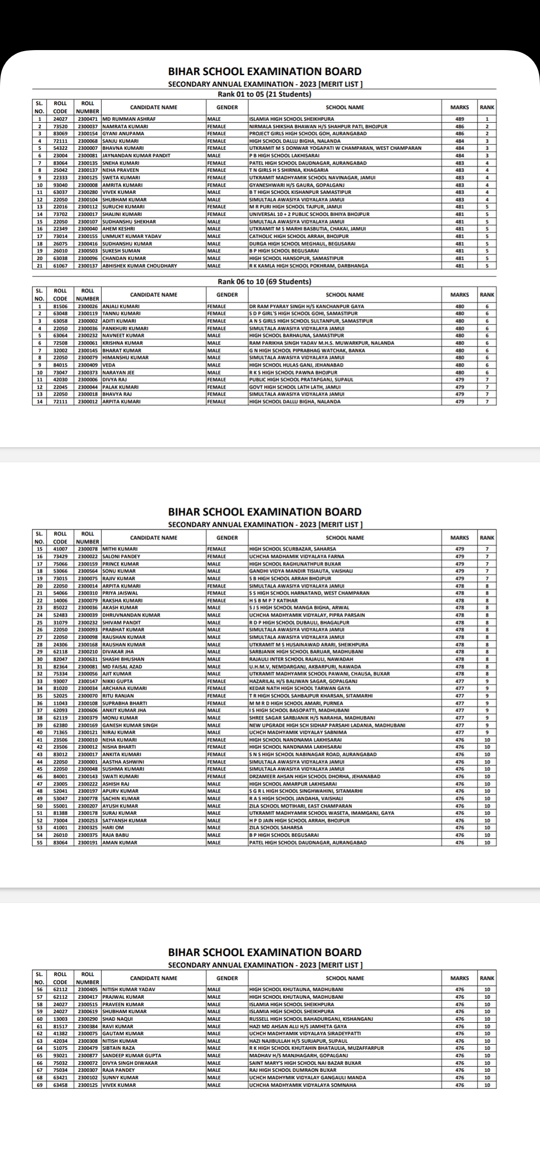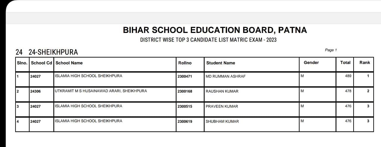 शेखपुरा जिले के शेखपुरा नगर परिषद में संचालित इस्लामिया उच्च विद्यालय का छात्र रुम्मन अशरफ बिहार टॉपर बना। अशरफ को 489 नंबर प्राप्त हुआ।